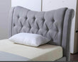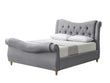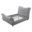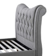 A chic grey fabric encases the Arizona linen bed, featuring a sleekly dipped headboard and footboard giving it a unique appearance. The bedframe is supported by four sturdy feet, each uniquely carved with a stunning button-back pattern on the headboard.