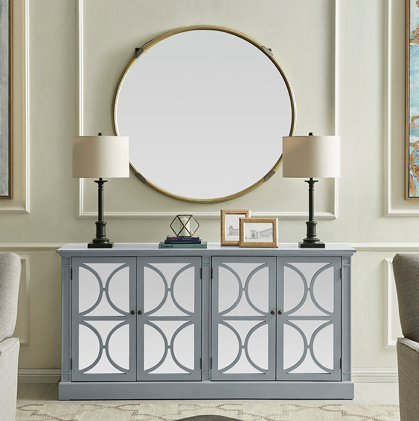 The Blakely 4 Door Sideboard - Grey is a statement piece that blends distinctive design with practical storage, making it a perfect addition to any modern home. Featuring elegant mirrored glass panels on the doors, this sideboard brings a touch of glamour while providing ample storage for dining ware, linens, or household essentials. The grey finish offers a contemporary yet timeless appeal, while the stylish design keeps it on-trend with modern interiors. Ideal for living rooms, dining rooms, or hallways, the Blakely Sideboard combines function and fashion to elevate your space.