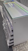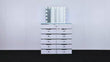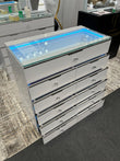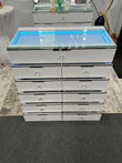 The 11 Drawer Chest is a stylish storage solution that combines elegance with functionality. Featuring eleven compact drawers with chrome trim and sparkling crystal handles, it’s perfect for organizing makeup, jewellery, and beauty accessories. The tempered glass table top adds a sleek, modern touch while ensuring durability. With button-controlled rainbow LED lighting inside the drawers, this mini chest brings a glamorous glow to your space.