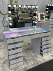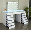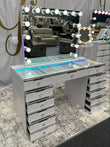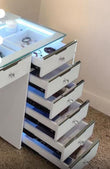 The 13 Drawer Glam Empire Vanity Table is the ultimate statement piece, offering unmatched storage and luxury design. With thirteen spacious drawers finished in chrome trim and sparkling crystal handles, it provides all the space you need for makeup, skincare, and accessories. A tempered glass table top adds durability and elegance, while built-in tech features make your routine seamless. Complete with wireless charging, USB ports, and button-controlled LED lighting with rainbow or 3 white light settings, this vanity is as glamorous as it is practical.