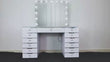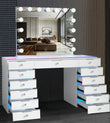 Pair the Glam Empire Pro 13 Drawer Vanity Table with the Glam Pro Max Mirror, featuring 15 LED bulbs. It also includes built-in Bluetooth speakers, a UK standard power socket ideal for hair tools and accessories, USB and USB Type-C charging ports, and a detachable magnifying mirror attachment for precision tasks. Designed with a removable base, the mirror can be used freestanding or mounted on the wall, creating a complete luxury vanity station that combines professional lighting with maximum storage. Bundle includes a mirror with 3 white light settings for professional makeup lighting, plus a rainbow backlight option for a bold, modern look.