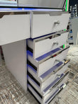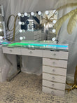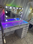 The Glam 8 Drawer Vanity Table is the ultimate beauty station, combining maximum storage with elegant design. Featuring eight spacious drawers with chrome trim and sparkling crystal handles, it offers plenty of room for your makeup, skincare, and styling essentials. A tempered glass table top adds a sleek and durable finish, while chrome legs provide strength and modern style. Complete with wireless charging, USB ports, and a choice of led lights in rainbow colours or 3 white light settings, this vanity blends glamour, functionality, and convenience.