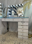 Pair the Glam 8 Drawer Vanity Table with the Glam Landscape Hollywood Makeup Mirror and enjoy the ultimate luxury vanity station. The mirror brings professional lighting with 12 LED bulbs, built-in Bluetooth speakers, a UK standard power socket ideal for hair styling tools, USB and USB Type-C charging ports, plus a detachable base that allows it to be used freestanding or mounted on the wall. Together, they create the perfect combination of stylish storage and flawless illumination. Bundle includes a mirror with 3 white light settings for professional makeup lighting, plus a rainbow backlight option for a bold, modern look.