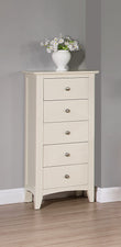 The Luciana 5 Drawer Narrow Chest in Ivory offers a perfect combination of modern elegance and practical design, making it an ideal addition to any bedroom. The soft ivory finish brings a sense of light and tranquillity to your space, while the slim, tall design makes it a versatile storage solution for smaller areas.