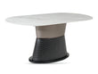 Stunning Portofino Sintered Stone Dining Table combines contemporary design with exceptional durability. 12mm white sintered stone top and wood frame with champagne-coloured top and black/white bottom. Luxurious faux marble base and rounded corners for added sophistication and safety.